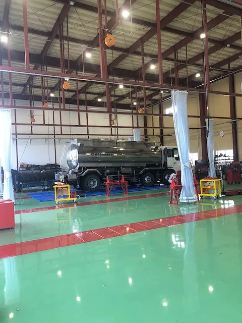 本社では、大型トラック、バスの全塗装が行える最新のプッシュプル式塗装ブースを導入。