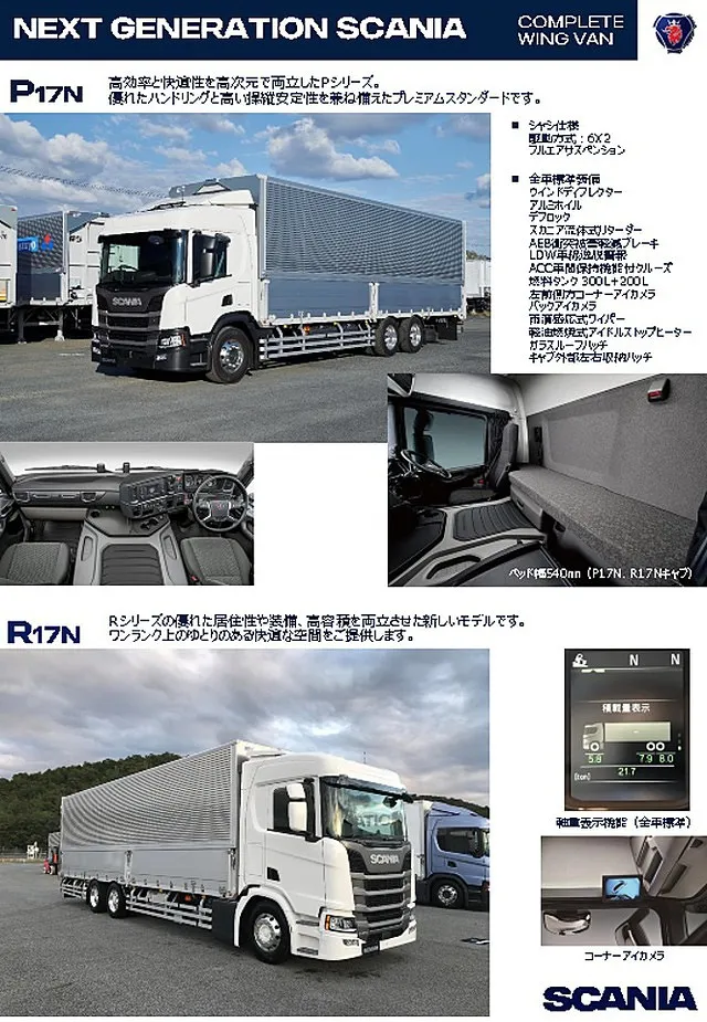 スカニアのエンジントルクの強さを生かし、箱容積確保のために国産車だと4軸低床車になるところを、スカニアだと3軸低床車にすることができ、箱容積が確保でき、3軸なので燃費も良いという長所を兼ね備えています。